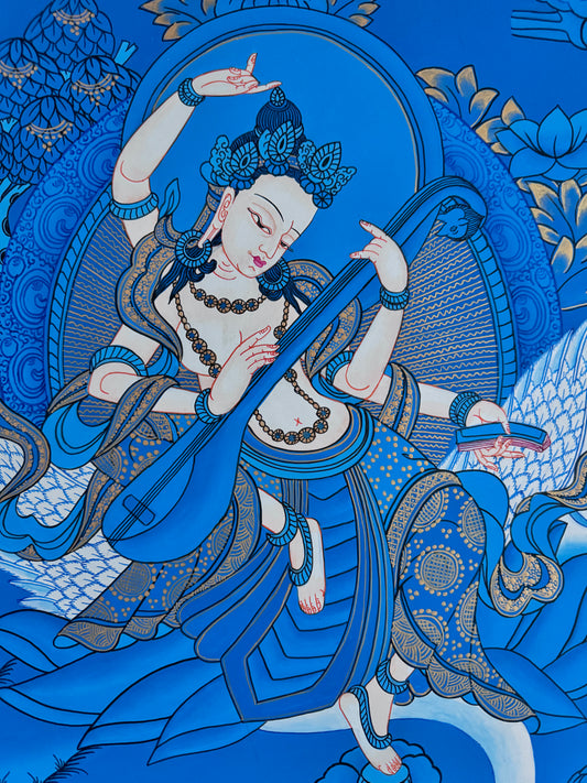 Saraswati in Blue Colour Thangka Painting