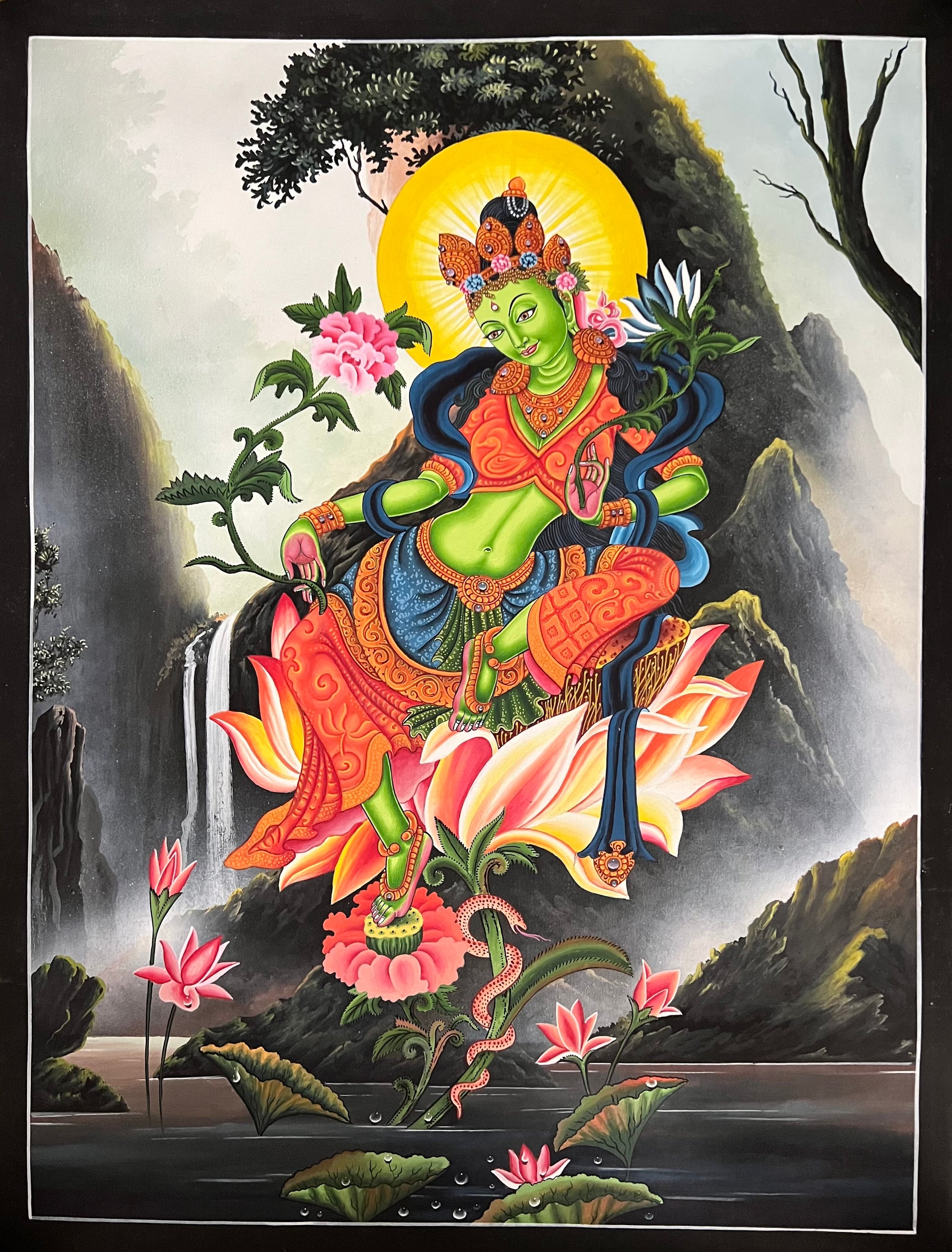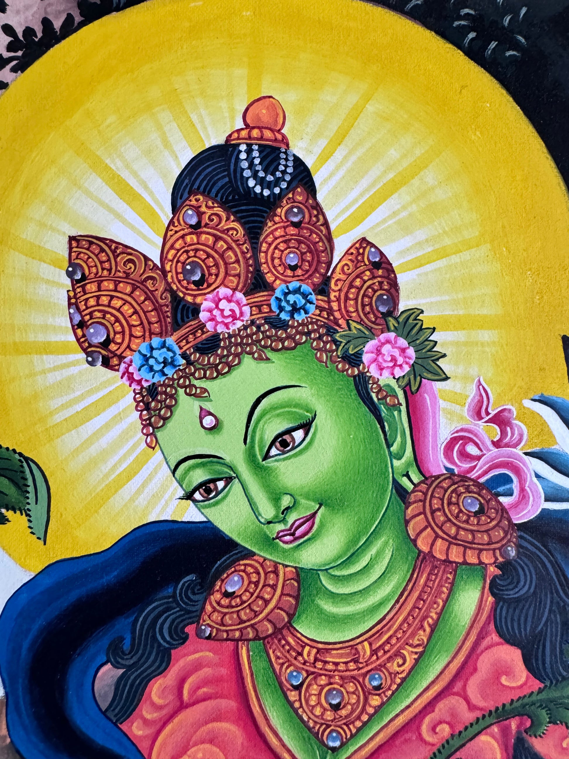 The Newari Green Tara thangka is a unique and culturally rich depiction of Green Tara, a beloved deity in Buddhism known for her compassion and swift assistance. Created by the Newari artists of Nepal, these thangkas are masterpieces characterized by intricate detailing and vibrant colours. Green Tara, often portrayed with one leg extended in readiness, symbolizes active compassion and the power to swiftly overcome obstacles. Her green colour represents renewal, energy, and her connection to nature, making her a powerful protector and guide.